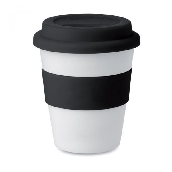 Este vaso ha sido fabricado de plástico en color blanco brillante, incluye una tapa y una faja de silicona antideslizante para tener un agarre firme y sin quemaduras. Tiene una capacidad interior de 350ml.
