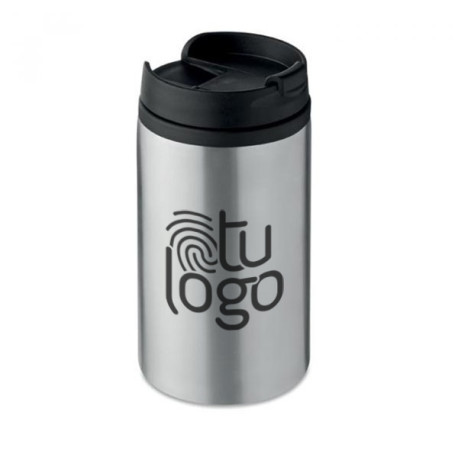 Vaso de doble capa (efecto termo) fabricado de acero inoxidable con interior en plástico. Ofrece una capacidad interior de 250ml y tiene un cierre hermético antifugas. Está disponible en varios colores e incluye embalaje en caja de cartón blanca.