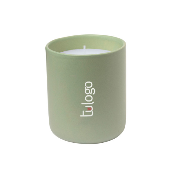 Vela aromática con aroma a vainilla en tarro de cerámica con elegantes tonos naturales. Disponible en variados colores y presentada en caja individual de diseño kraft. Ideal para personalizar con tu logo como regalo promocional.